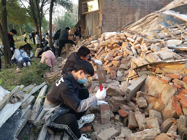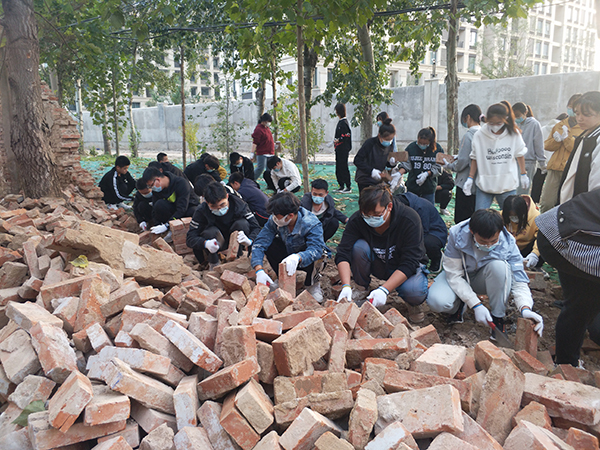 此次劳动教育实践活动场地在学校最西边,主要工作是把拆掉的墙头砖块上的沙灰清理干净,以便重新使用。在学校领导的带领下,大家分工协作,井然有序,他们利用工具或者徒手将粘在一起的砖块分开,用手中的瓦刀将砖块上的沙灰清理干净。有的自行搬运砖块,有的成组结对传递搬运砖块,将砖块集中存放并摆放整齐。大家不怕苦、不怕累,一个个笑容满面,干劲十足,感受着集体劳动带来的趣味,现场一派热火朝天的劳动景象。经过两次劳动,共清理出来约5万块砖。
