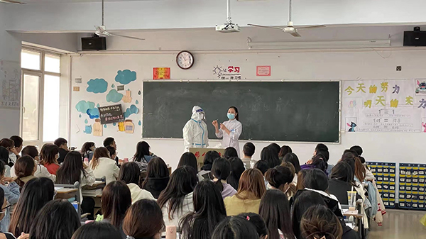 此次培训共分3个批次,每次培训4个班级,由学校第二附属医院医务人员讲解,重点培训了穿脱防护服、核酸检测咽拭子样本采集方法和标本转运等内容。通过此次培训,不仅让同学们掌握了核酸应急检测采集及防护技能,还使同学们在疫情防控中经风雨、见世面、壮筋骨、长才干,为核酸采集工作提供强有力的技术人才支撑。