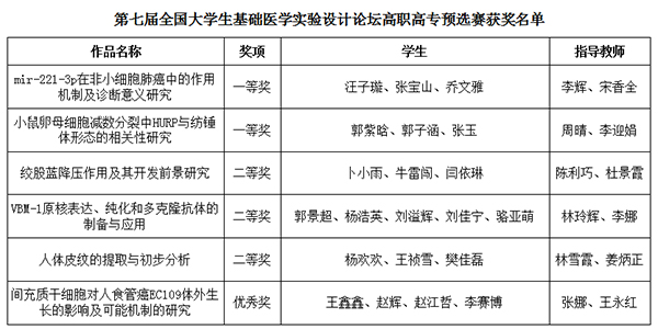 全国大学生基础医学创新论坛暨实验设计大赛由教育部高等学校国家级实验教学示范中心联席会基础医学组主办,每两年举办一次,是全国基础医学教育领域影响力最大的大学生创新设计大赛活动和基础医学学科竞赛平台。此次大赛首次开通高职高专赛道,2007太阳集团首次参加即取得佳绩,展现了2007太阳集团教学水平和学生良好的精神风貌,对提高教师科研能力、促进创新型基础医学人才培养起到了很好的推动作用。
