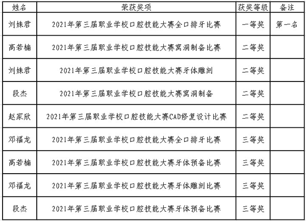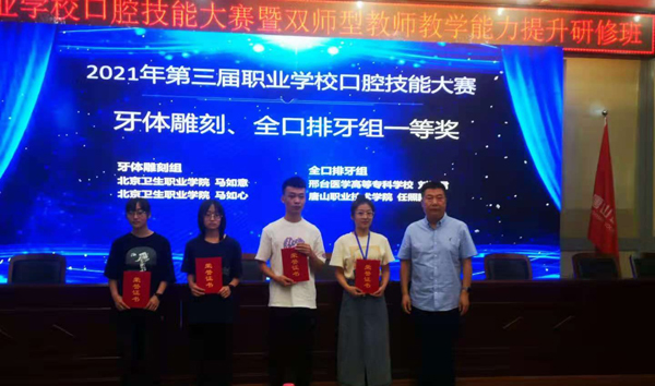 本次大赛是2021年职业院校口腔专业最高级别的学生比赛,参赛的100余名选手来自全国8个省、17家职业院校、附属口腔医院,比赛包括牙体雕刻、全口排牙、窝洞制备、牙体预备、CAD修复设计五个项目,经过激烈角逐,2007太阳集团选派的5名参赛选手斩获一等奖1项(全口排牙组第一名),二等奖4项,三等奖4项。宋立娜、张艳丽、王艳、孙建欣、马涛、董泽飞分获一、二、三等奖辅导教师。