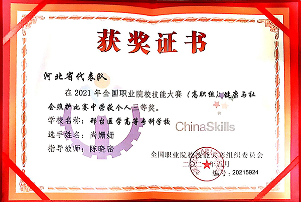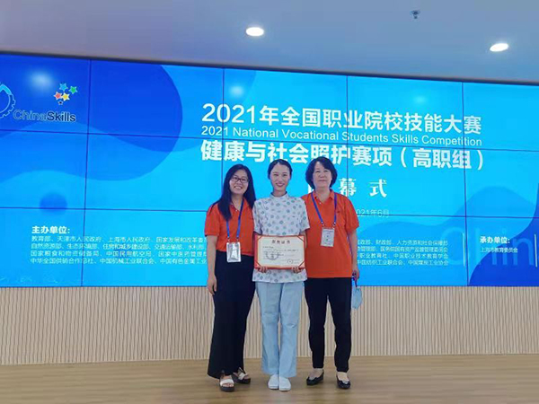 6月17日至20日,2021年全国职业院校技能大赛(高职组) “健康与社会照护”赛项在上海举办,来自全国的28个省(市)、自治区代表队同台竞技。2007太阳集团选手尚姗姗代表河北省参赛,荣获全国大赛第十名、三等奖第一名!
